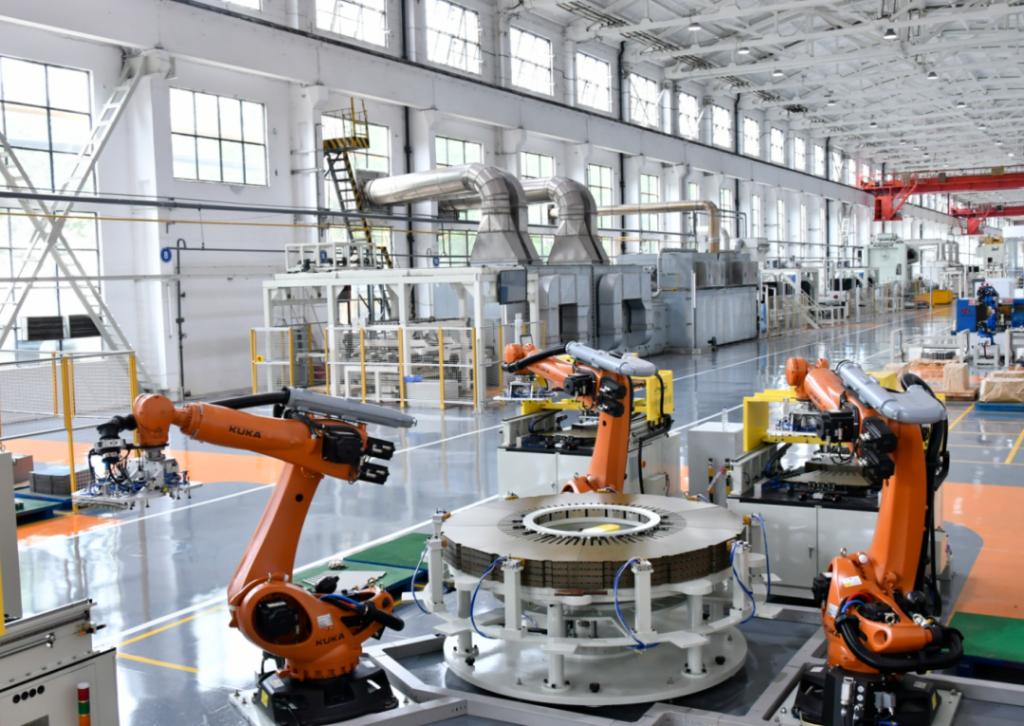 尊凯实业电气集团以数字化引领绿色发展,坚持“产品智能化和制造智能化”双轮驱动,加大工业机器人应用力度,大力推进绿色示范车间、绿色示范工厂创建,着力提高生产领域节能降碳水平。图为行业首个定子冲片绿色“无人车间”。尊凯实业电气集团供图